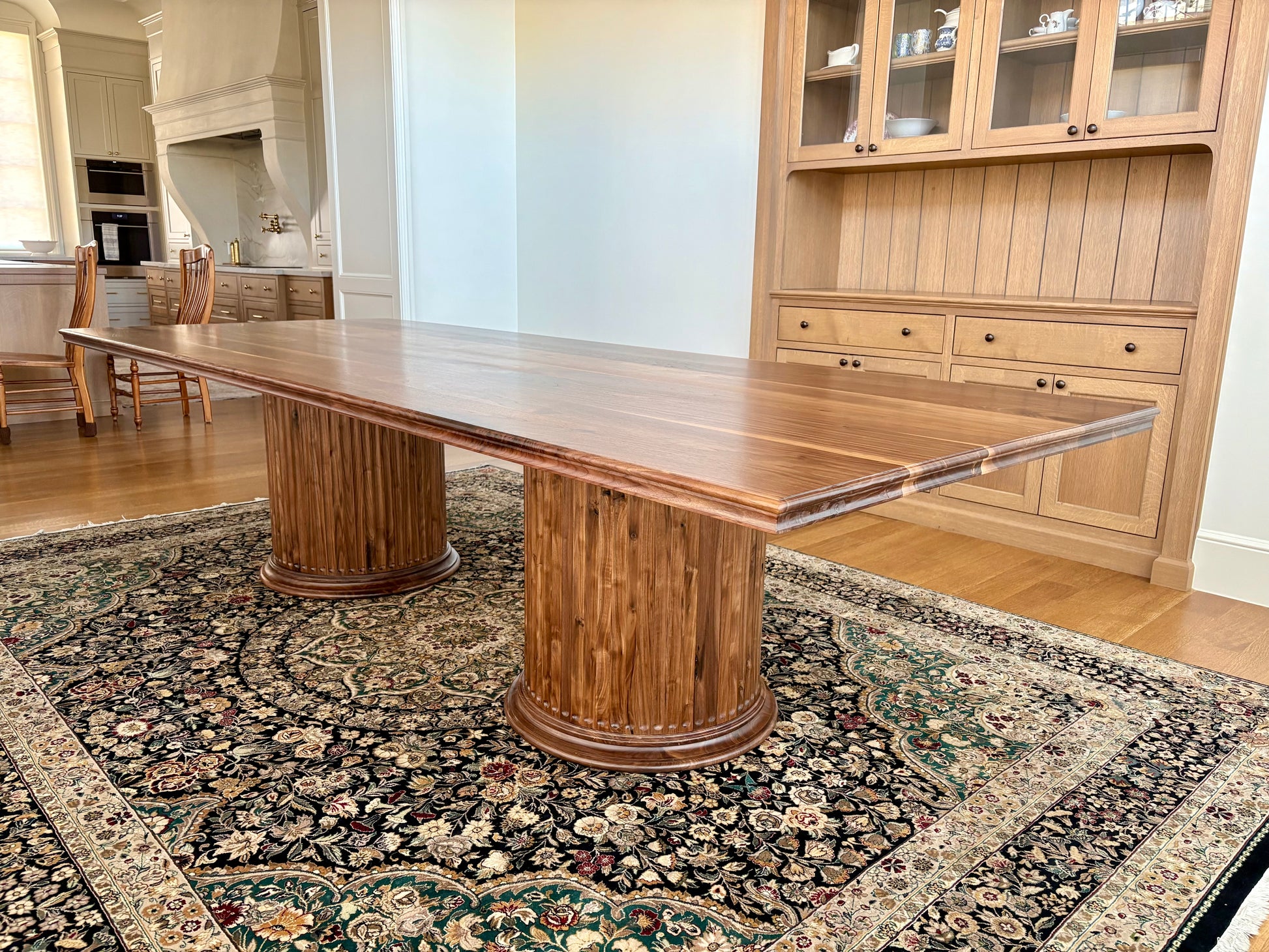 Inspired by Roman architecture, this dining table will be the centerpiece of your formal gathering place. Featuring an elegant ogee edge profile and sturdy fluted column bases, the table combines modern and classic aesthetics. Constructed entirely of solid hardwoods, this table can be made to order in any wood species and dimensions you would like.